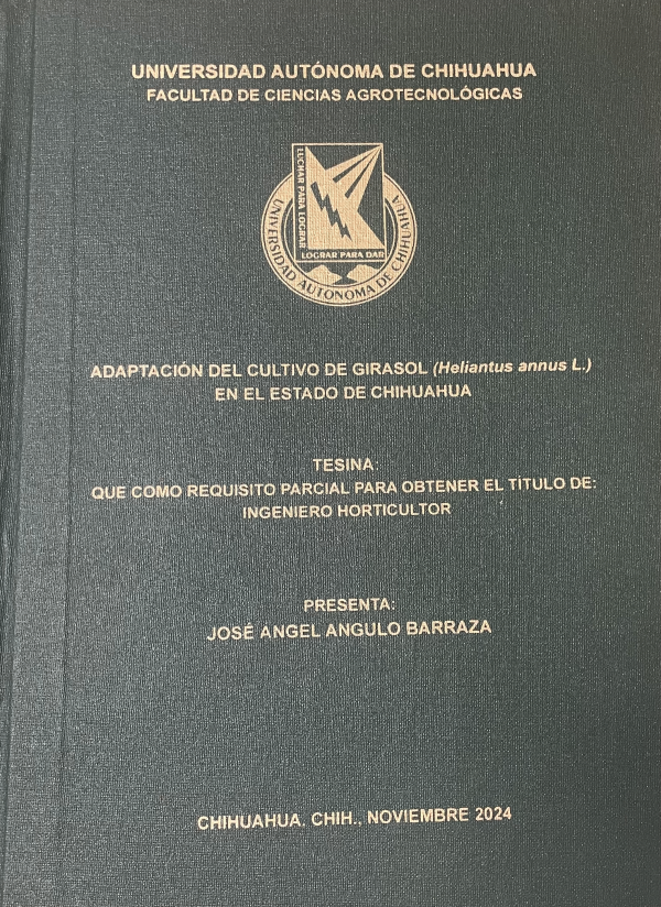 Adaptación del cultivo de girasol (Heliantus annus L.) en el estado de Chihuahua / José Ángel Angulo Barraza; dirección Rosa María Yáñez Muñoz; asesoría Ramona Pérez Leal, Lorenza Esther Martínez Escudero, María Janeth Rodríguez Roque