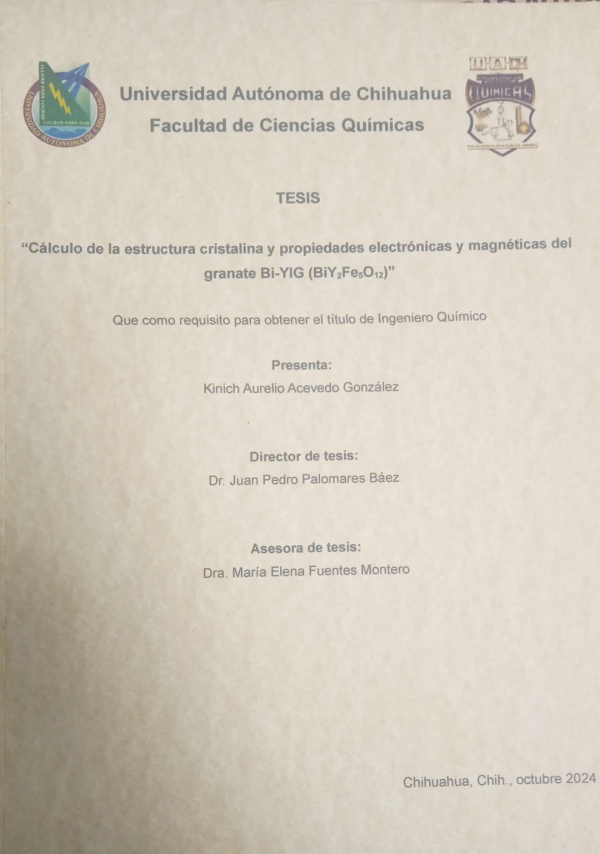 Cálculo de la estructura cristalina y propiedades electrónicas y magnéticas del granate Bi-YIG (BiY2Fe5O12) / Kinich Aurelio Acevedo González; asesoría María Elena Fuentes Montero