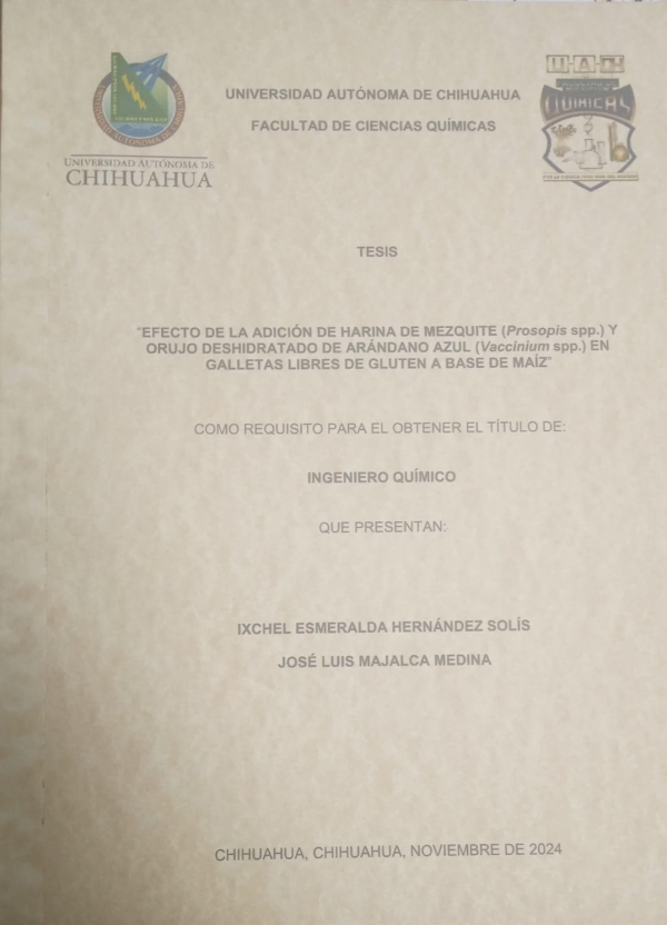 Efecto de la adición de harina de mezquite (prosopis spp.) y orujo deshidratado de arándano azul (vaccinium spp.) en galletas libres de gluten a base de maíz / Ixchel Esmeralda Hernández Solís, José Luis Majalca Medina; dirección Miguel Ángel Sánchez Madrigal