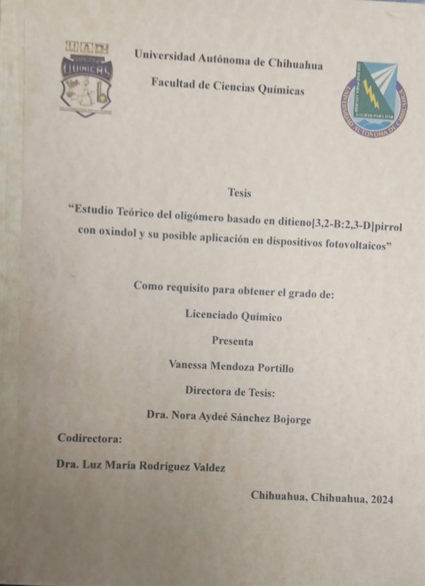 Estudio teórico del oligómero basado en ditieno [3,2-B:2,3-D] pirrol con oxindol y su posible aplicación en dispositivos fotovoltaicos / Vanessa Mendoza Portillo; dirección Nora Aydeé Sánches Bojorge