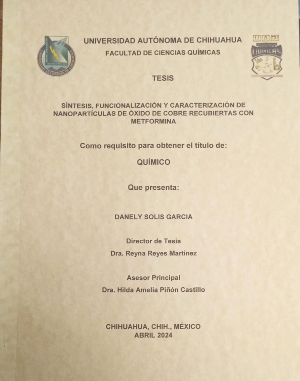 Síntesis, funcionalización y caracterización de nanopartículas de óxido de cobre recubiertas con metformina / Danely Solis García; dirección Reyna Reyes Martínez