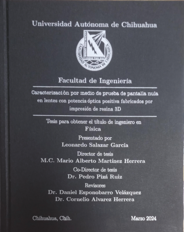 Caracterización por medio de prueba de pantalla nula en lentes con potencia óptica positiva fabricados por impresión de resina 3D / Leonardo Salazar García; dirección Mario Alberto Martínez Herrera