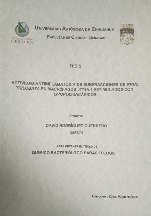 Actividad antiinflamatoria de subfracciones de Rhus Trilobata en Macrófagos J774A.1 estimulados con Lipopolisacáridos / David Rodríguez Guerrero; dirección Blanca Estela Sánchez Ramírez