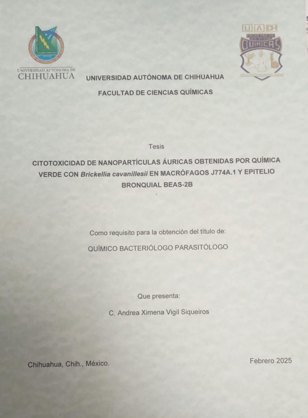 Citotoxicidad de nanopartículas áuricas obtenidas por química verde con Brickellia cavanillesii en macrófagos J774A.1 y epitelio bronquial BEAS-2B / Andrea Ximena Vigil Siqueiros; dirección Luis Varela Rodríguez