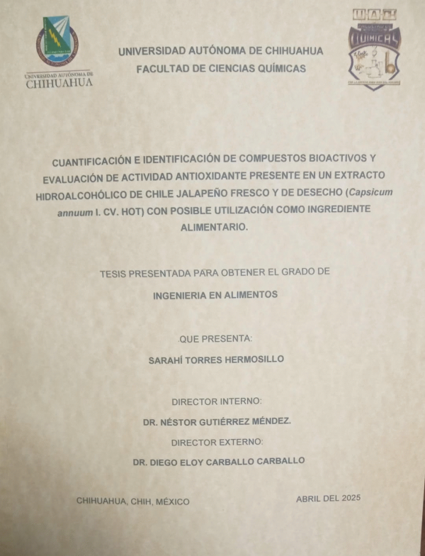 Cuantificación e identificación de compuestos bioactivos y evaluación de actividad antioxidante presente en un extracto hidroalcohólico de chile jalapeño fresco y de deshecho (Capsicum annuum I.CV.HOT) con posible utilización como ingrediente alimentario / Sarahí Torres Hermosillo; dirección Nestor Gutiérrez Méndez