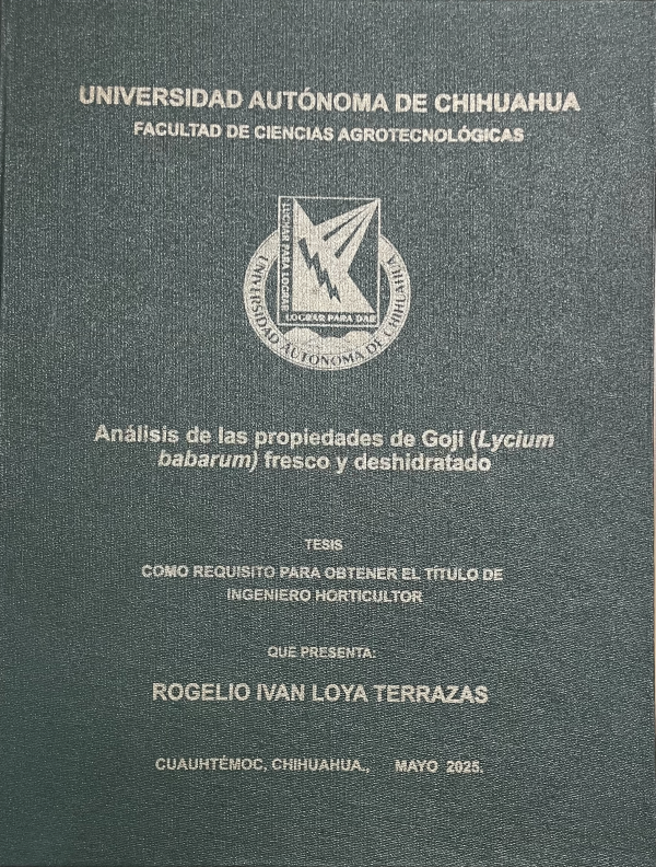 Análisis de las propiedades de Goji (Lycium babarum) fresco y deshidratado / Rogelio Iván Loya Terrazas; dirección María Antonia Flores Córdova; codirección Sandra Pérez Álvarez; asesoría Nora Aideé Salas Salazar, María Janeth Rodríguez Roque, Mayra Cristina Soto Caballero