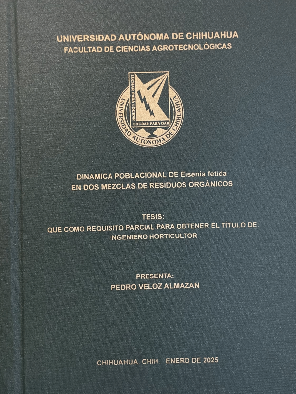 Dinámica poblacional de eisenia fétida en dos mezclas de residuos orgánicos / Pedro Veloz Almazán; dirección Ofelia Adriana Hernández Rodríguez; codirección Andrés Francisco Martínez Rosales; asesoría Dámaris Leopoldina Ojeda Barrios, Francisco Javier Piña Ramírez, Rafael Ángel Parra Quezada